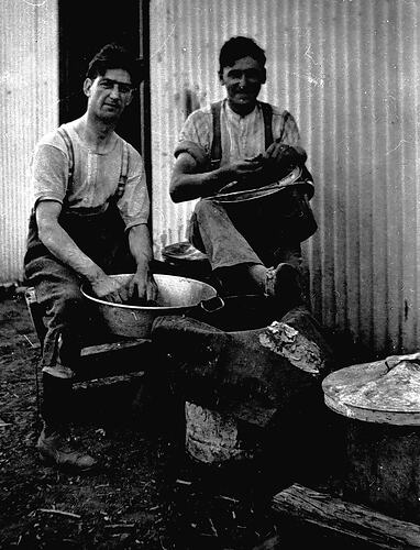 Two soldiers on fatigue duty at an army kitchen.