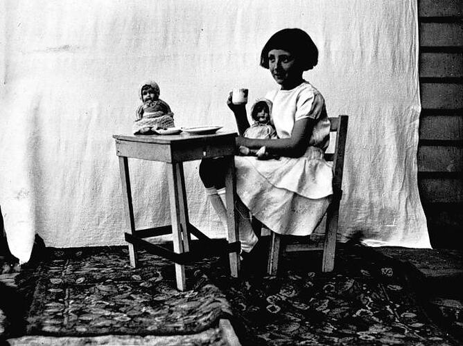 Dorothy Fiddes sitting on a chair, holding a doll and a tea cup. There is another doll and a plate on the table. Dorothy is wearing a dress and long socks.