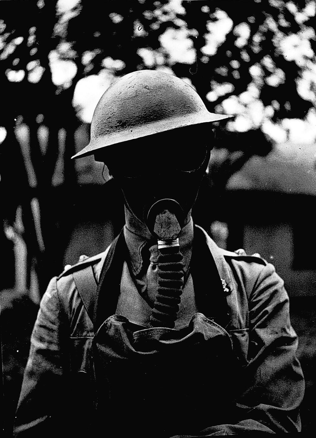 An army lieutenant wearing a gas mask and helmet.