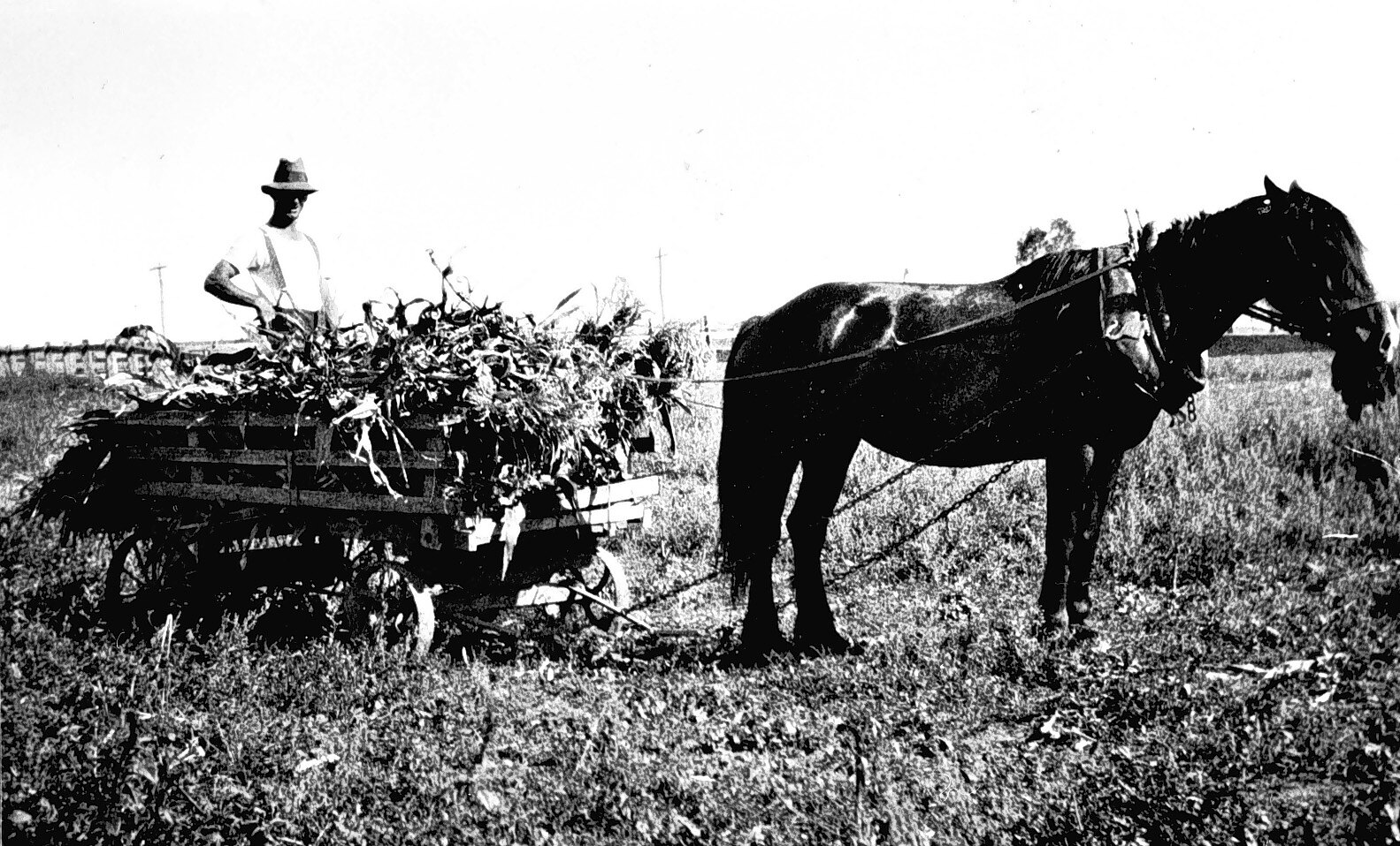 Joe Coloe standing on a horse-drawn wagon which is filled with Branches. There is a small fence to the left.