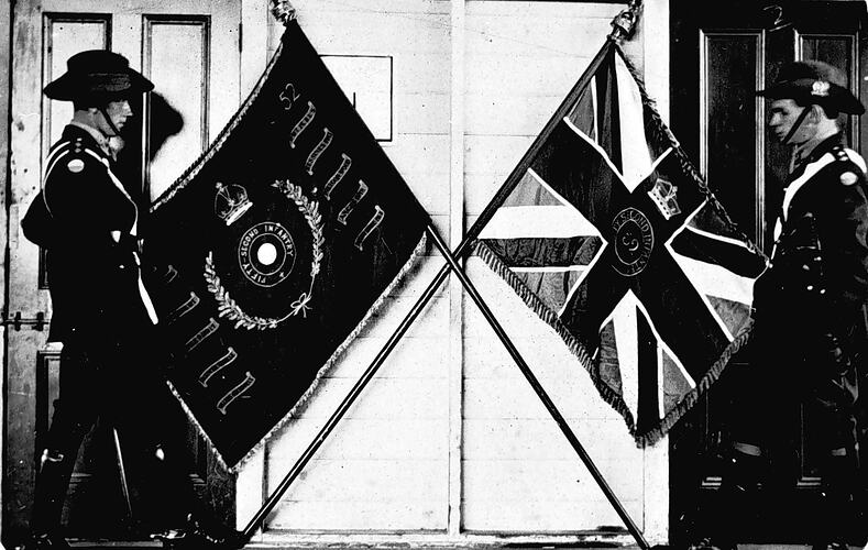 Two soldiers with flags belonging to the 52nd Infantry Battalion. The flag on the left carries battle honours.