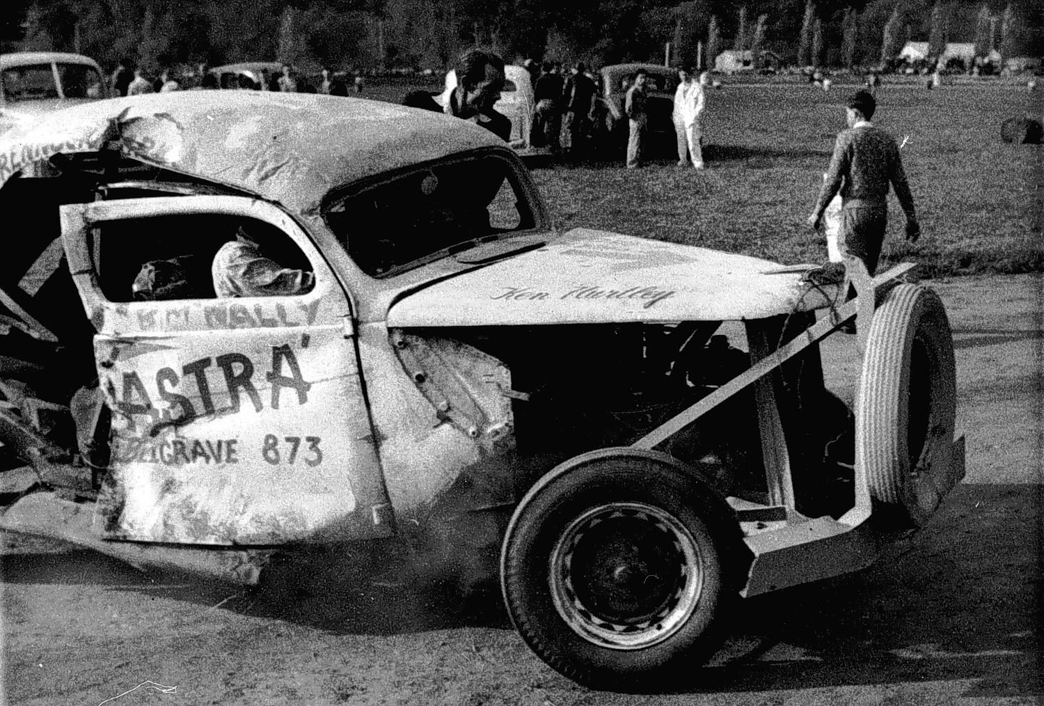 A man sitting in a damaged car, on which 'Belgrave 873' is painted.There is another man standing beside the passenger door. There are other people and cars in the background.