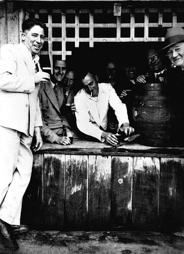 Four men at Myers Picnic. One is filling a glass from a beer barrel.