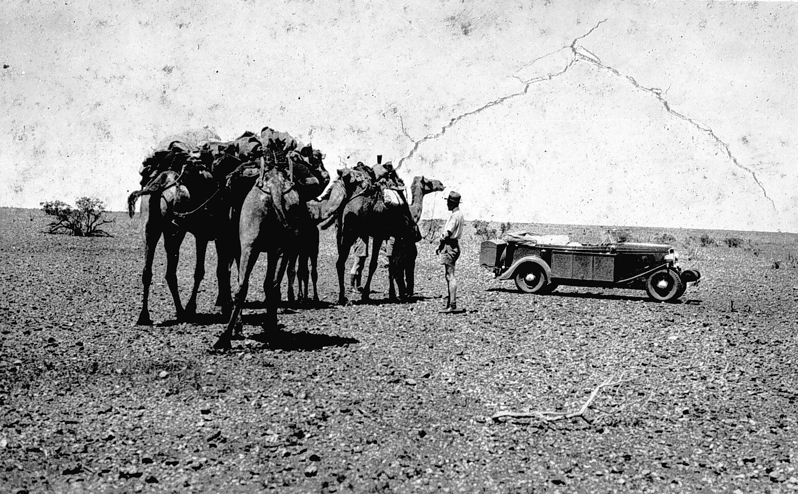 A Ford Tourer Model B car and two men with their camel team consisting of four camels. The landscape is bare with a single bush in the back left of the image.