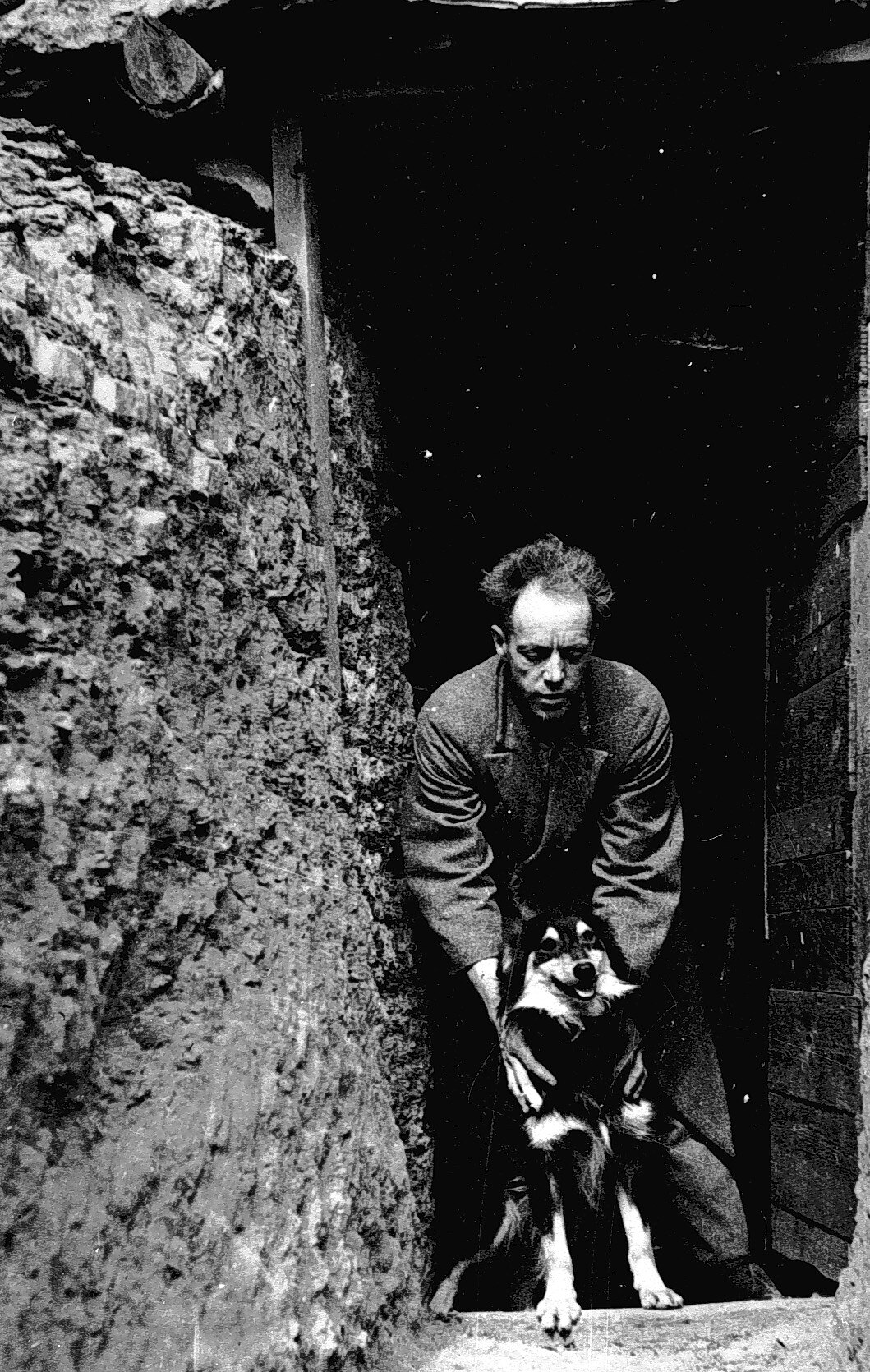 A man and his dog in the entrance to their underground home. He was the Coober Pedy JP and an opal buyer.
