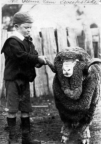 A young boy holding one horn of a prize winning ram on 'Pendale' farm.