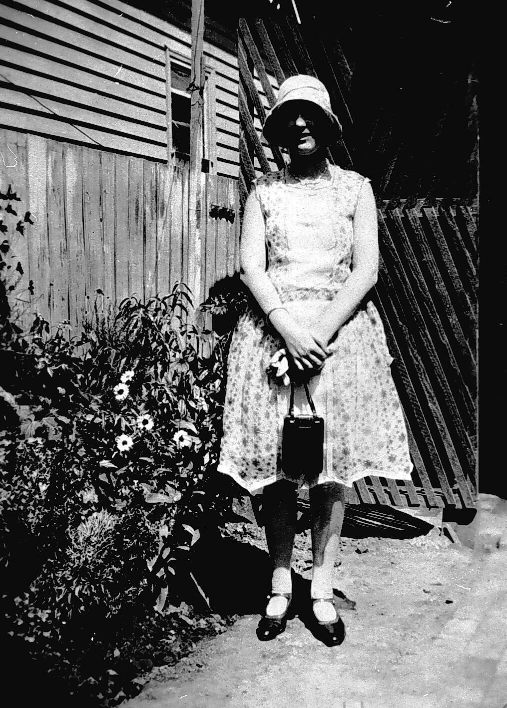 A woman standing in a backyard. She is wearing a hat and carrying a handbag.