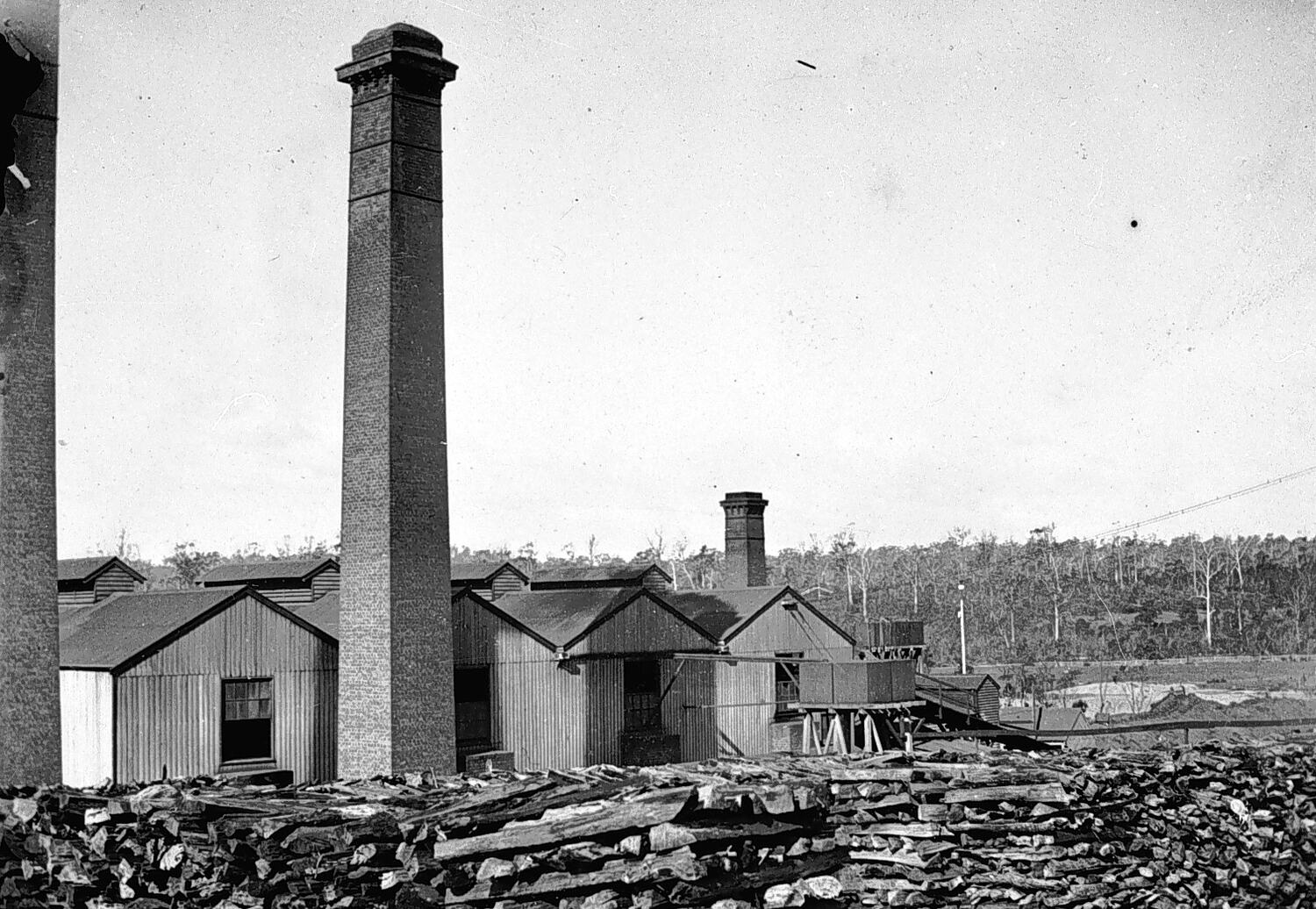 A wood yard with a factory in the background.
