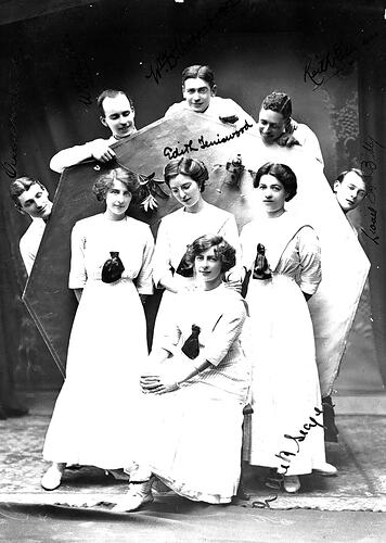 A group of actors. Either the play was called 'The Mountebanks' or that may have been the name of the group. Four women stand in front of a cut out while five men peer around it.