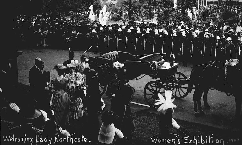 Arrival of Lady Northcote for the opening of a women 's exhibition. She has arrived in a horse-drawn carriage and there is a guard of honour across the street.