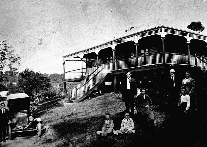 Family in front of house on a banana farm. The house is a 'Queenslander' and there is a Ford truck on the left They have dressed up for the photograph.