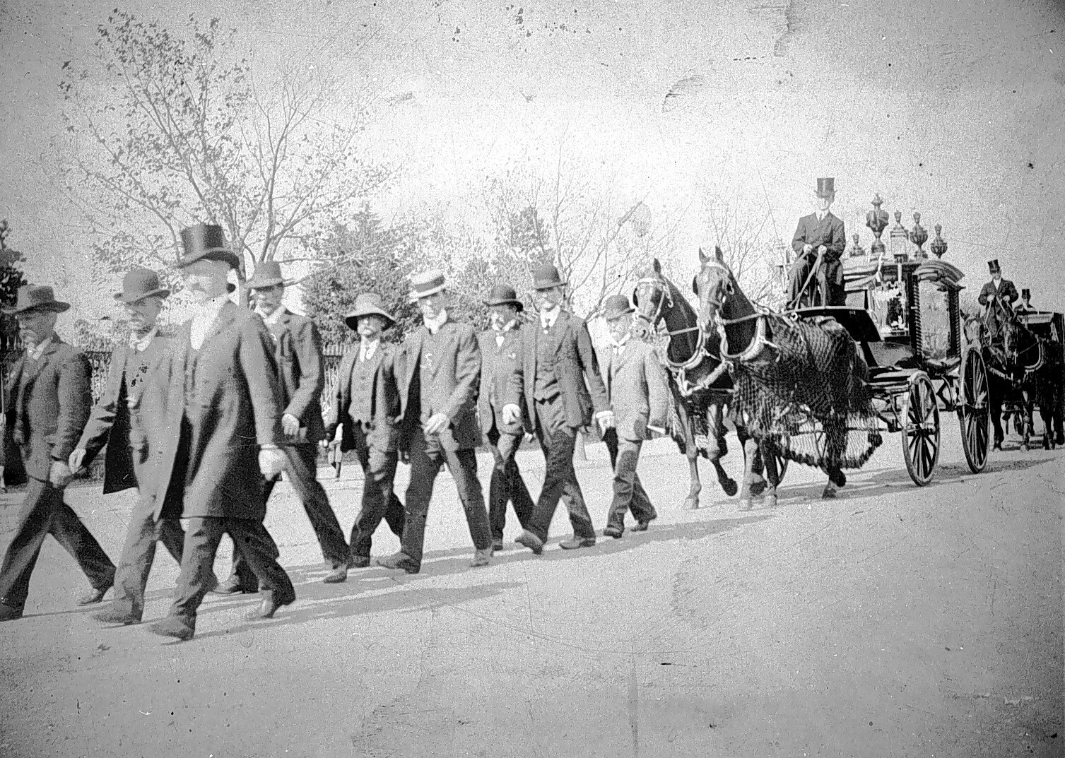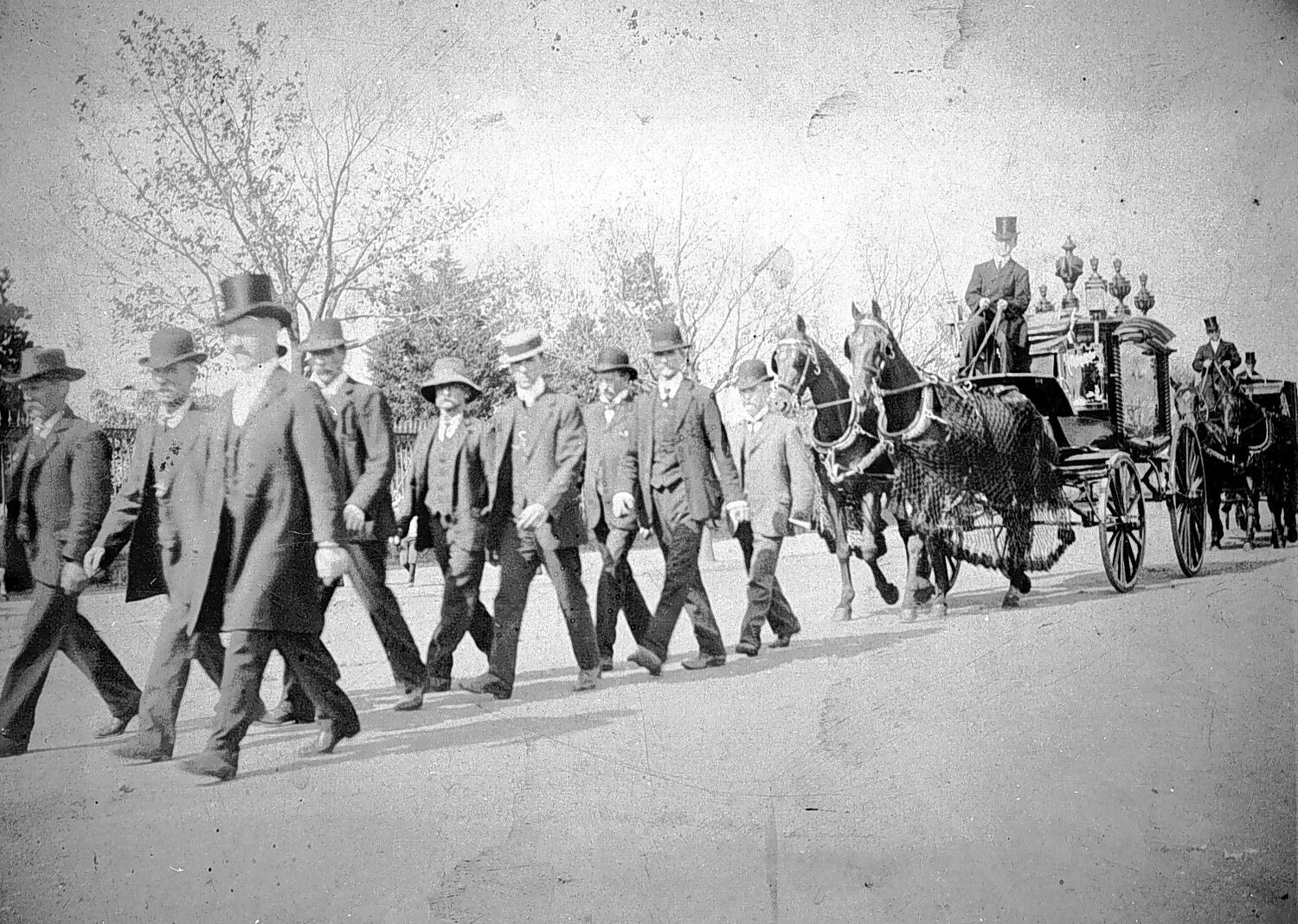 A group of mourners leading a funeral procession. There is a horse-drawn hearse following the mourners.
