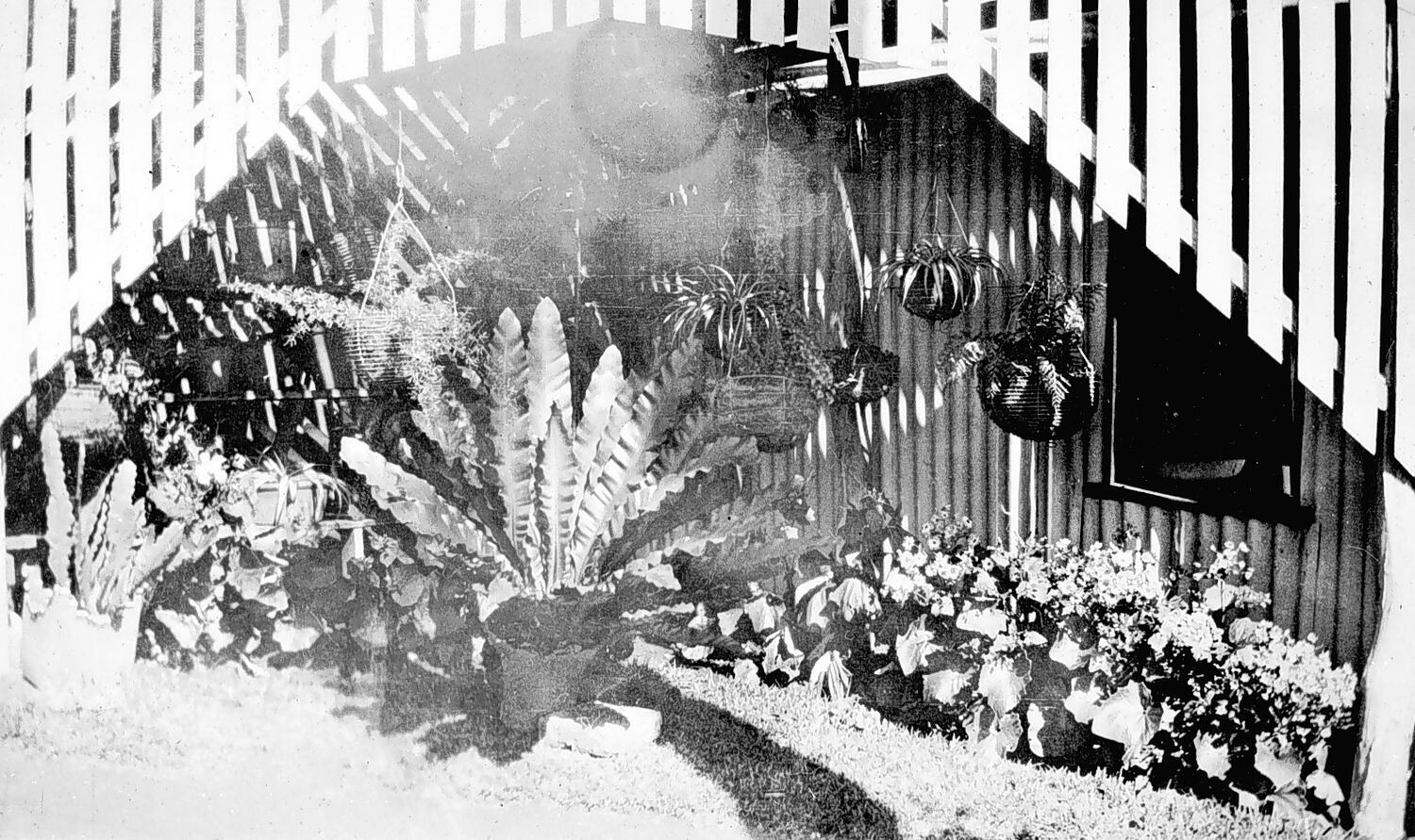 A fernery under part of a house, there are hanging baskets and ferns in pots on a pot stand.