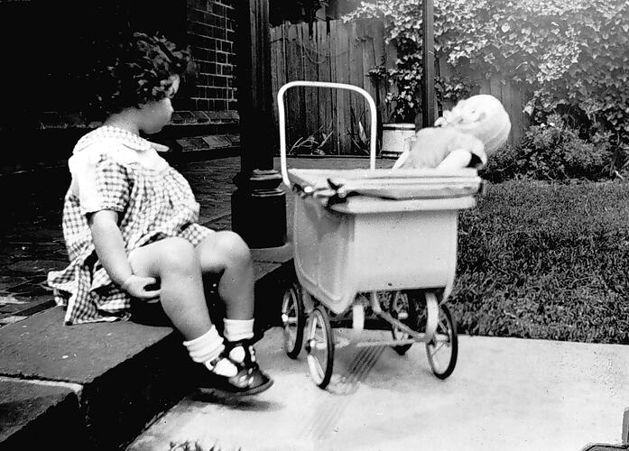 Children, Clothing, Dolls, Fences, Garden Paths, Gardens, Houses, Prams, Verandahs