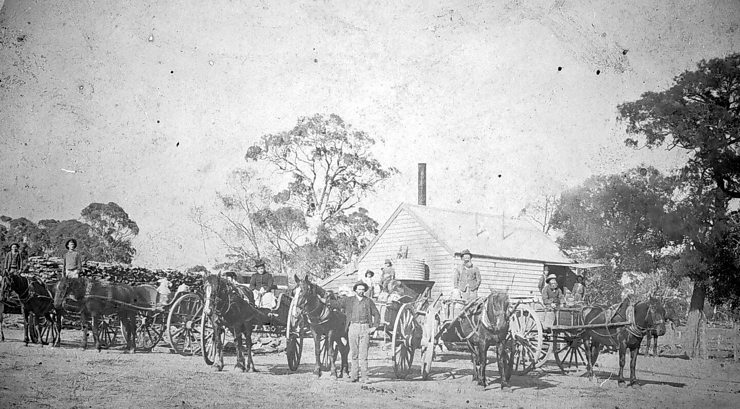 Men and horse-drawn carts outside the Newham Creamery (?).