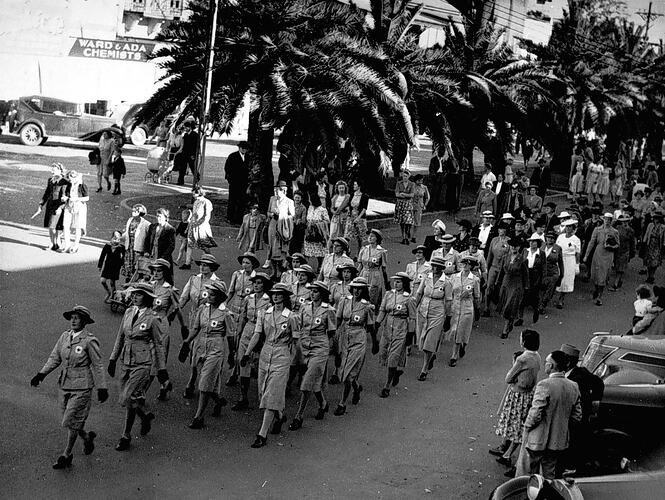 A Victory in the Pacific Day march. A group of women in the Red Cross are marching.