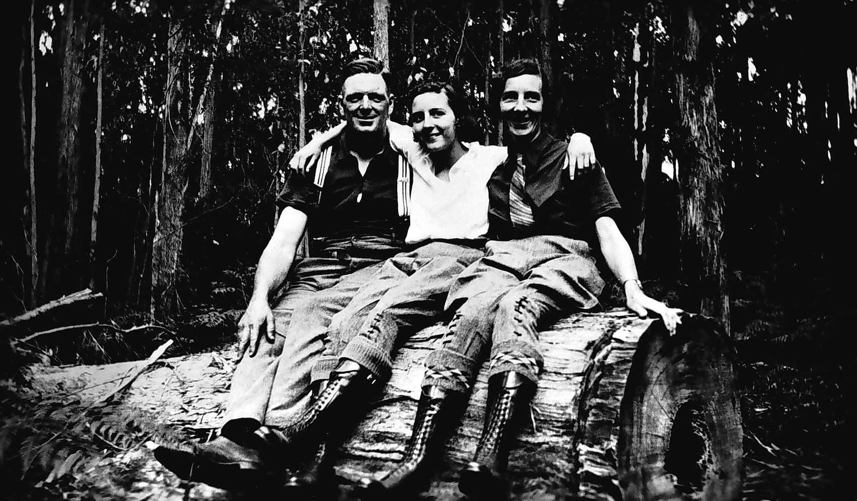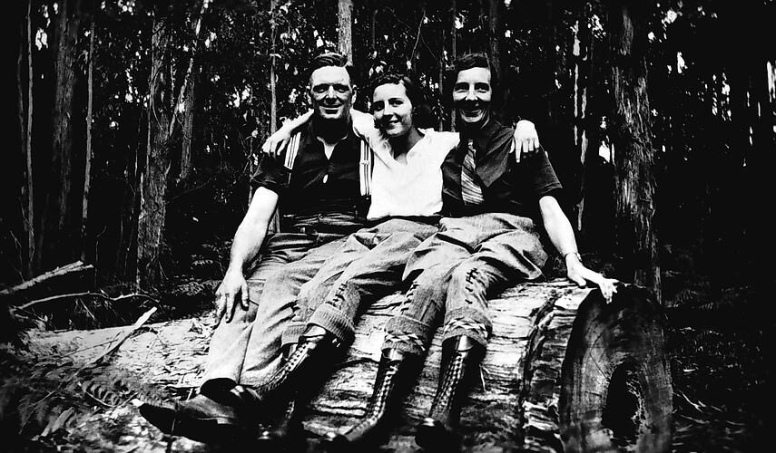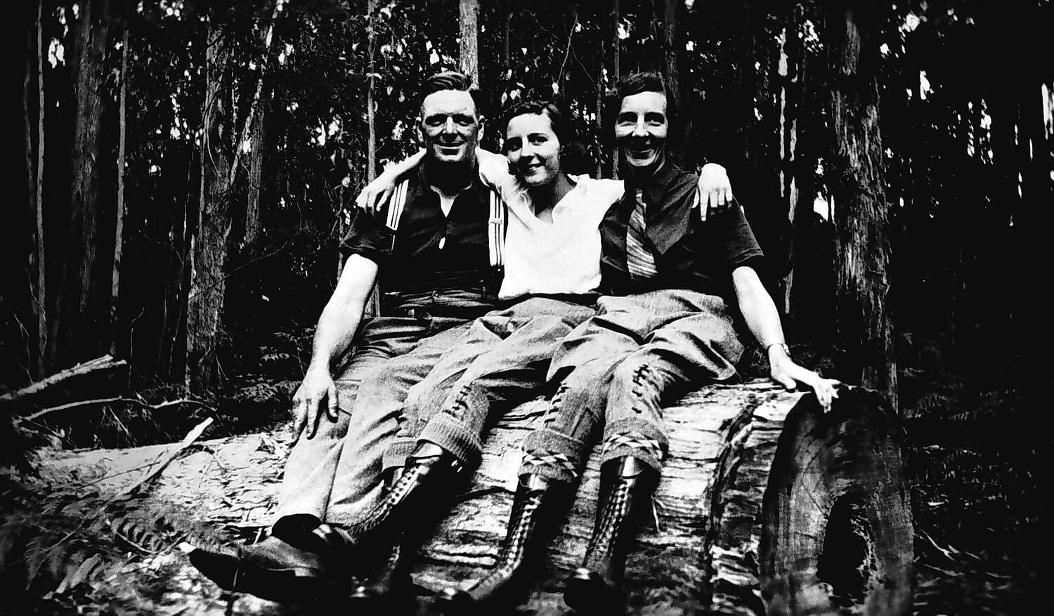 A man and two women sitting on a log in the bush.