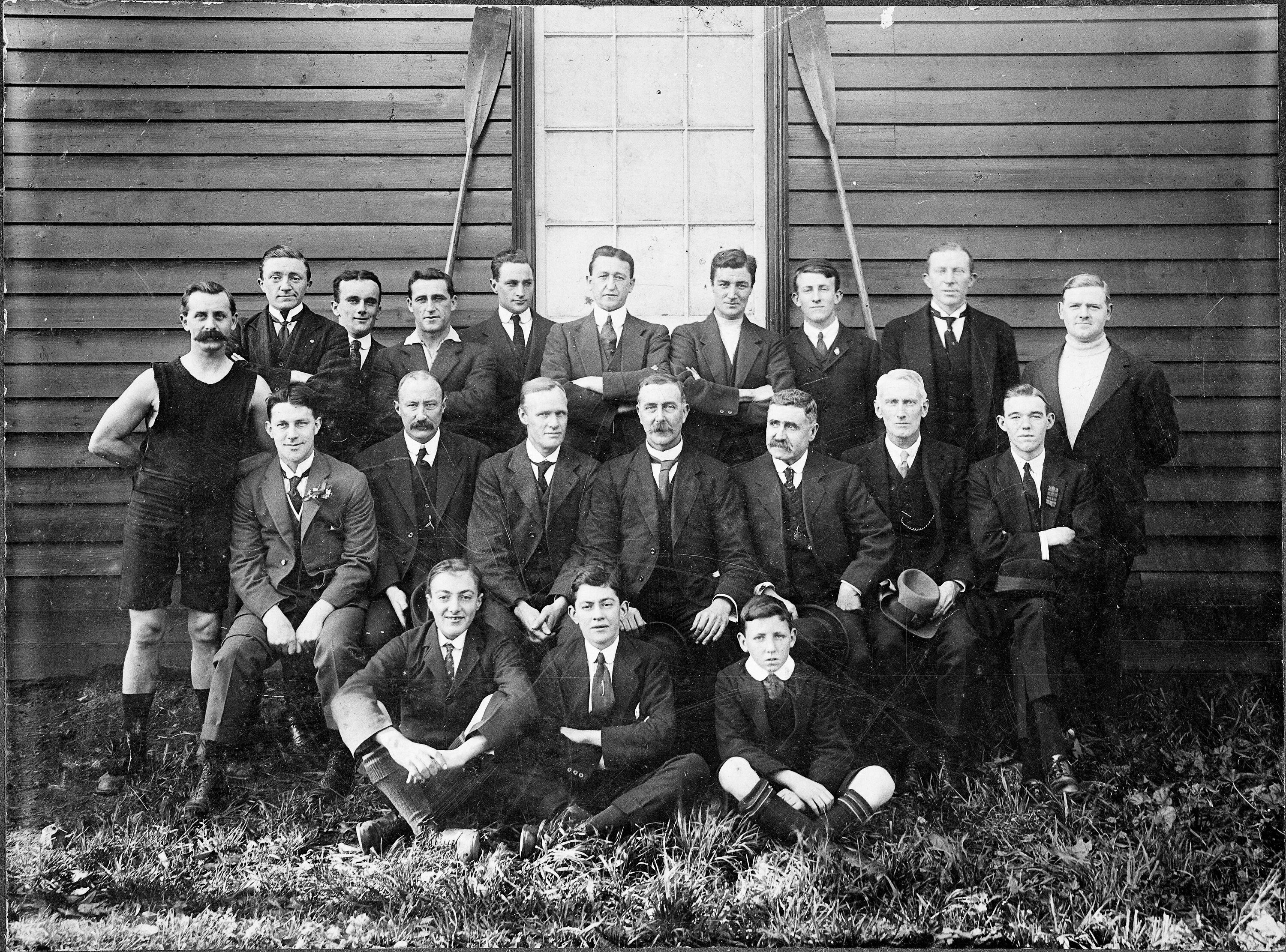 Photograph of members of the Yarra Yarra Rowing Club. It was taken during World War I, when most members were at the war.