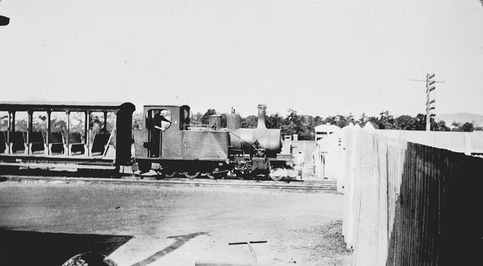 A steam tram and carriages. The carriages are open sided.