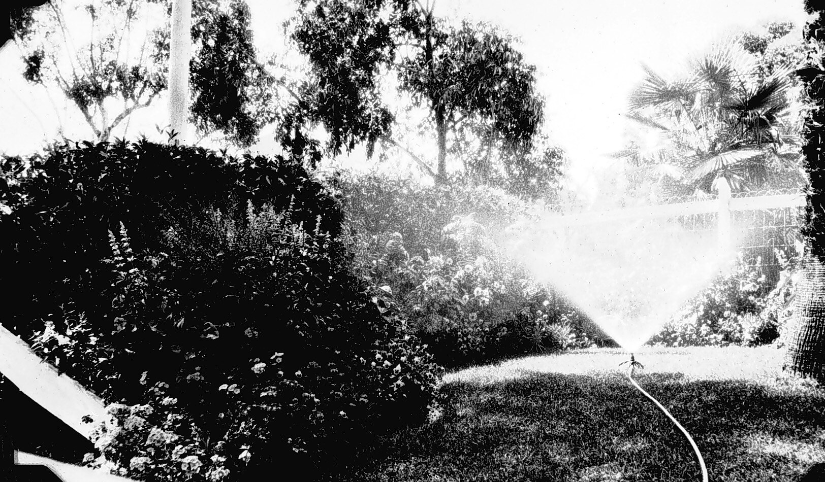 A garden with a sprinkler running.