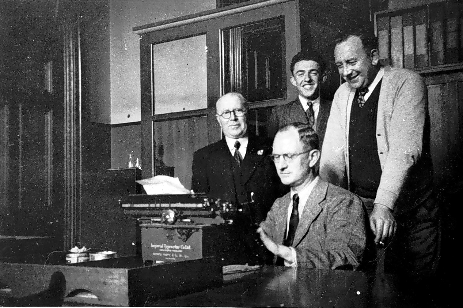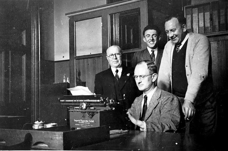 Four men in a office, room 112 in an unidentified building. One man is seated at a typewriter while the others stand behind him.