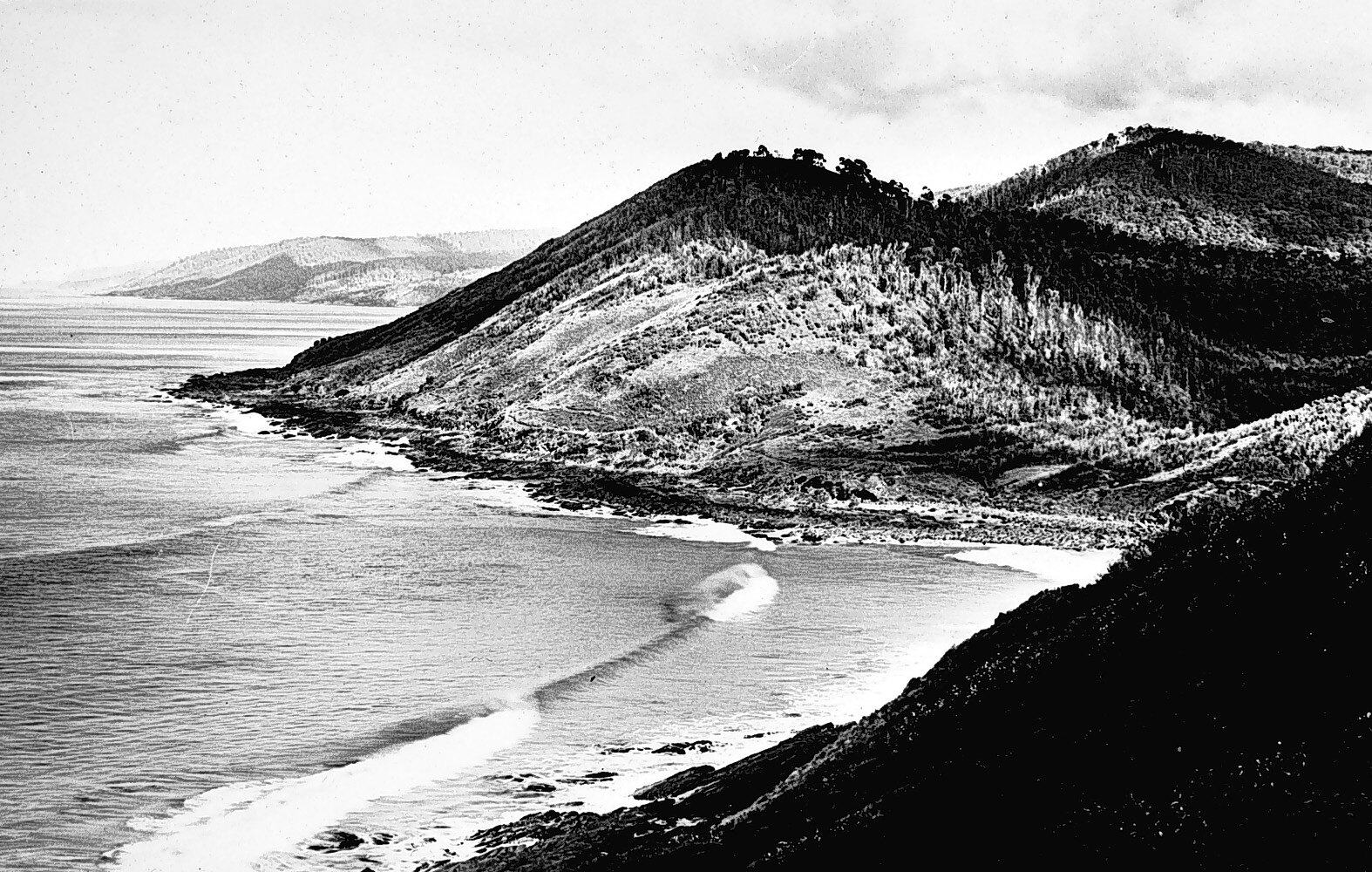 A small bay in the foreground with two headlands behind.