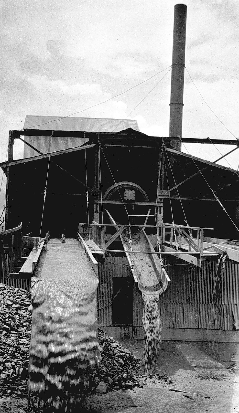 Mine buildings. Mud and water are being pumped from the mine.