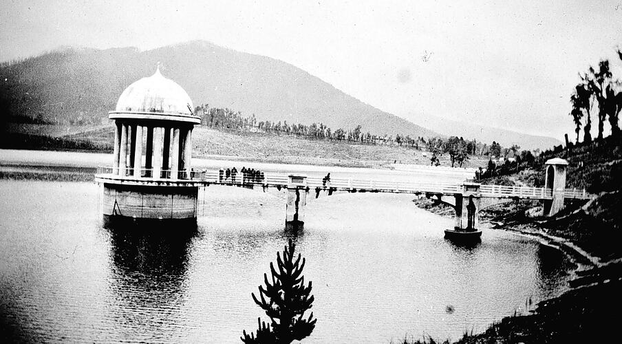 People on the bridge leading to the control tower on the Maroondah Reservoir Mt Riddell is in the background.