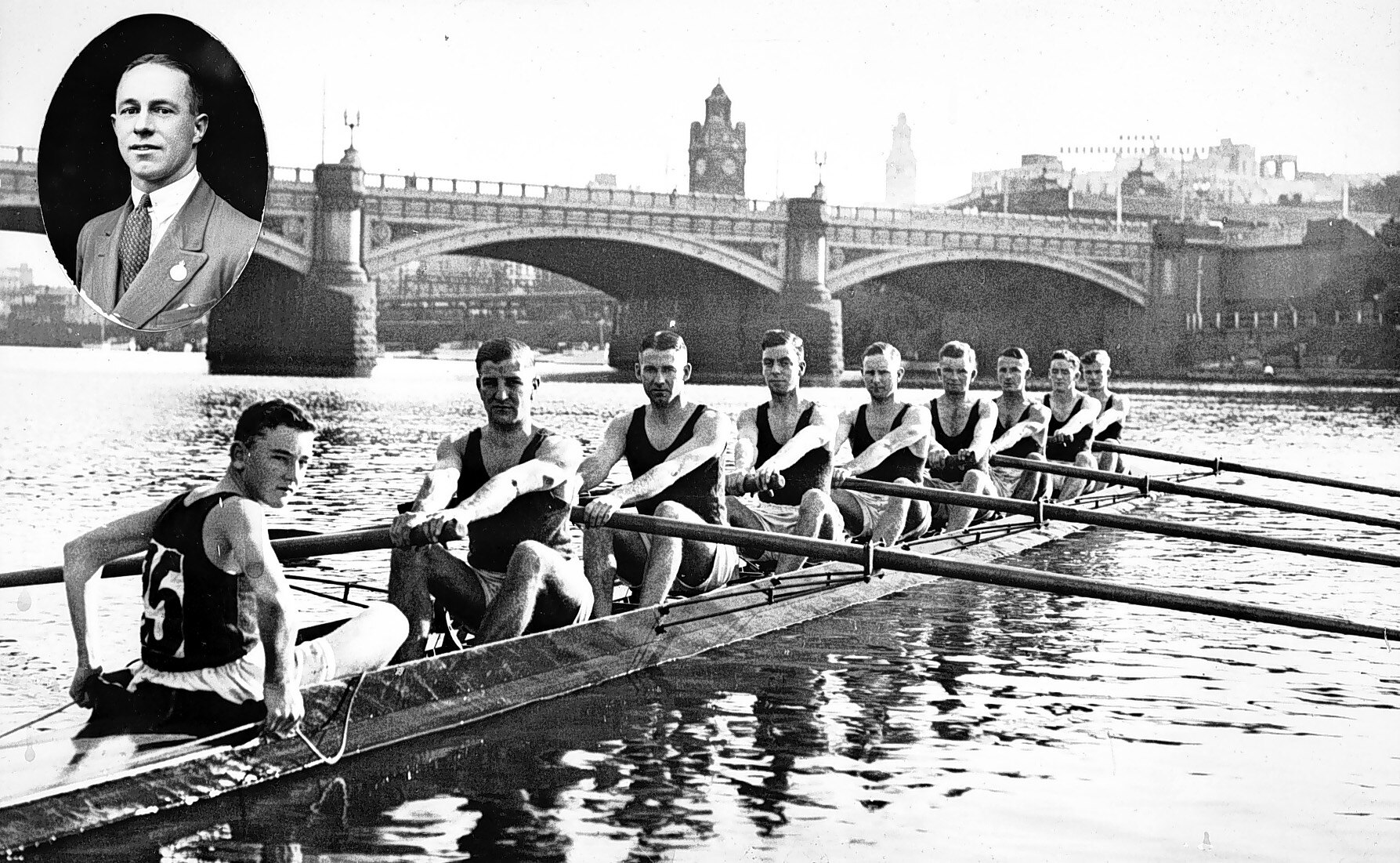 Members of the Yarra Yarra Rowing Club who had just won a lightweight novice eight at the Metropolitan Regatta. Princes Bridge is in the background and the clock at Flinders Street Railway Station behind that. A photograph of their coach appears as an.
