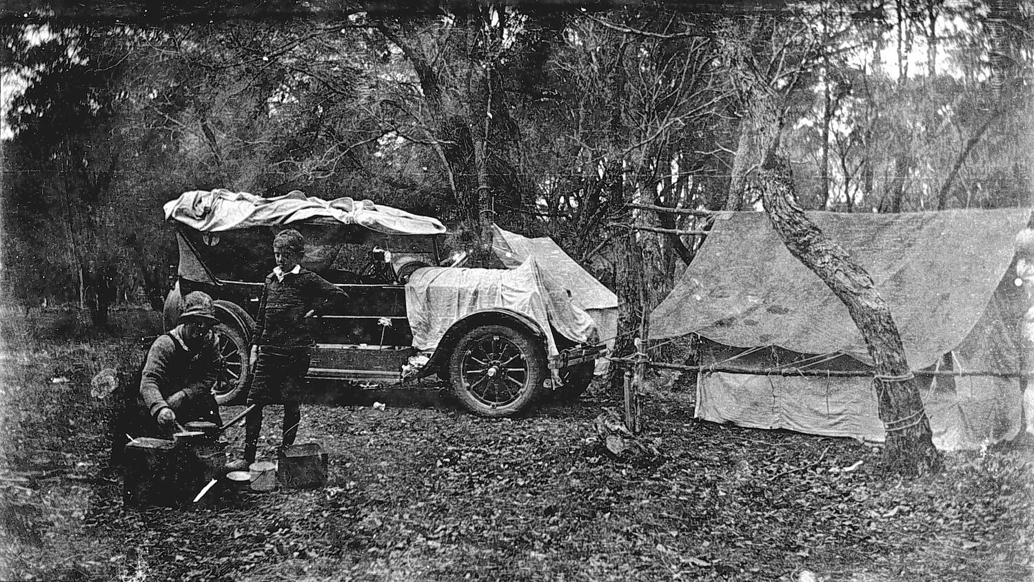Cooking on a campfire beside tents. There is a car (covered with tarpaulins) in the background.