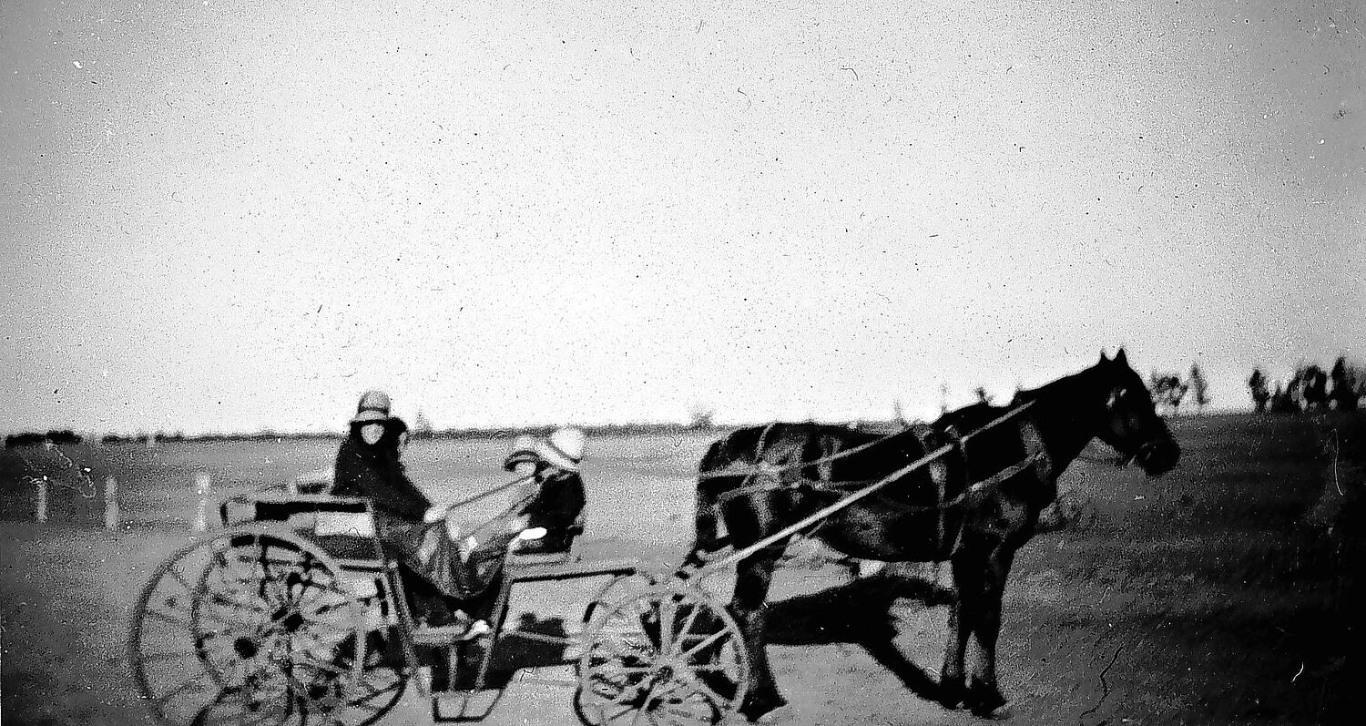 A woman and children in a horse-drawn carriage.