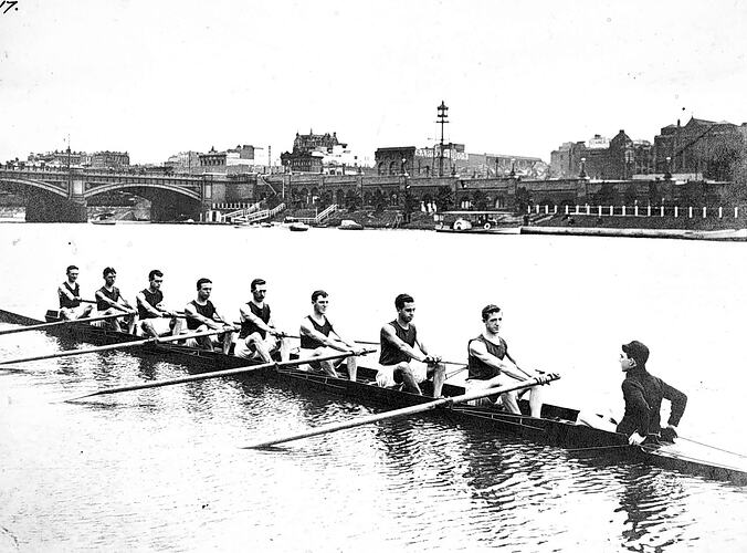 A team from the Yarra Yarra Rowing Club who had just won a maiden eight at the Upper Yarra Regatta. Princes Bridge is in the background.