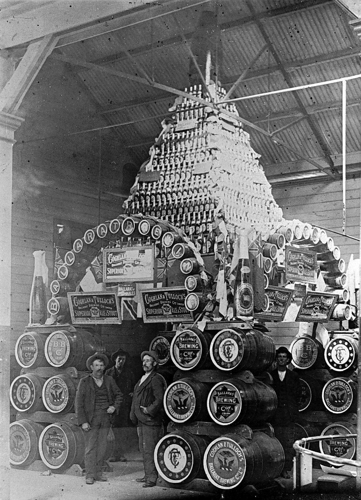 Ballarat Brewing Company display at an annual exhibition of Ballarat industry, a pyramid of bottles is supported by a stand of beer barrels.