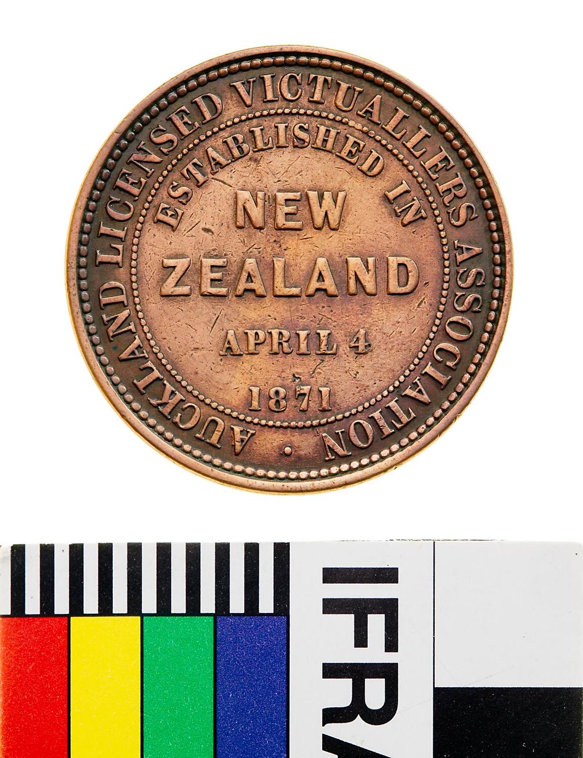Obverse: AUCKLAND LICENSED VICTUALLERS ASSOCIATION ESTABLISHED IN NEW ZEALAND APRIL 4 1871 Reverse: VICTORIA BORN MAY 24 1819