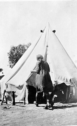 A woman entering a bell tent. Two bell tents were used as bedrooms to a two room cottage.