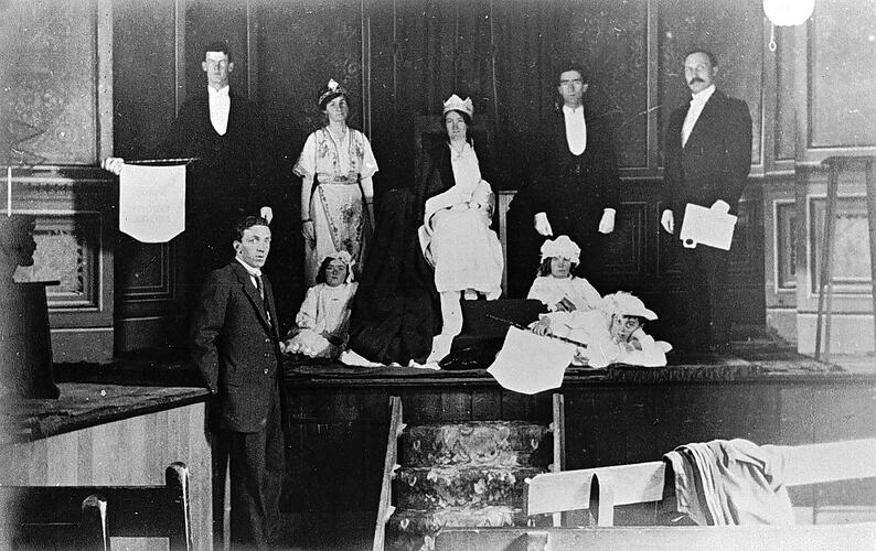 The queen of a friendly society seated on a stage. She is flanked by her attendants.