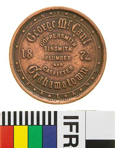 Copper One Penny Token, minted by an unknown British mint. Issued by George McCaul, Grahamstown, 1874. George McCaul was born in Perthshire, Scotland, in 1835. When the gold rushes began in Australia he travelled to Adelaide and then to the gold fields. He tried his luck again in the early 1860s when gold was discovered in New Zealand, sailing to Gabriel's Gully, near Lawrence in Otago province. He moved on to the Hokitika fields when gold was discovered there. To get there, he had to cross New Zealand's South Island from east to west. Many men died during the journey. McCaul did not have any luck at the Hokitika fields either. After abandoning gold prospecting McCaul moved to Grahamstown in Thames, in the north of the North Island, where he returned to his trade as a plumber, gasfitter, tinsmith and coppersmith.