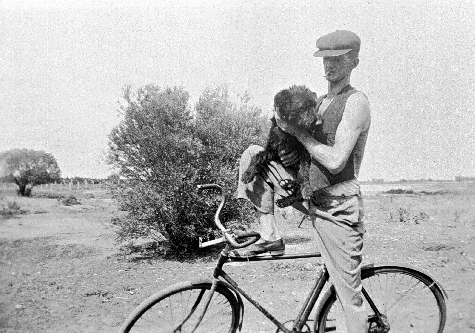 A man holding a dog. He is standing beside a bicycle with one foot on the cross bar of the bicycle. He is supporting the dog on the raised leg.