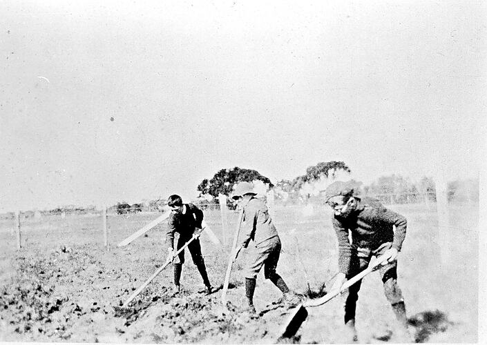 Three school boys digging at a working bee on the Cocamba School grounds.