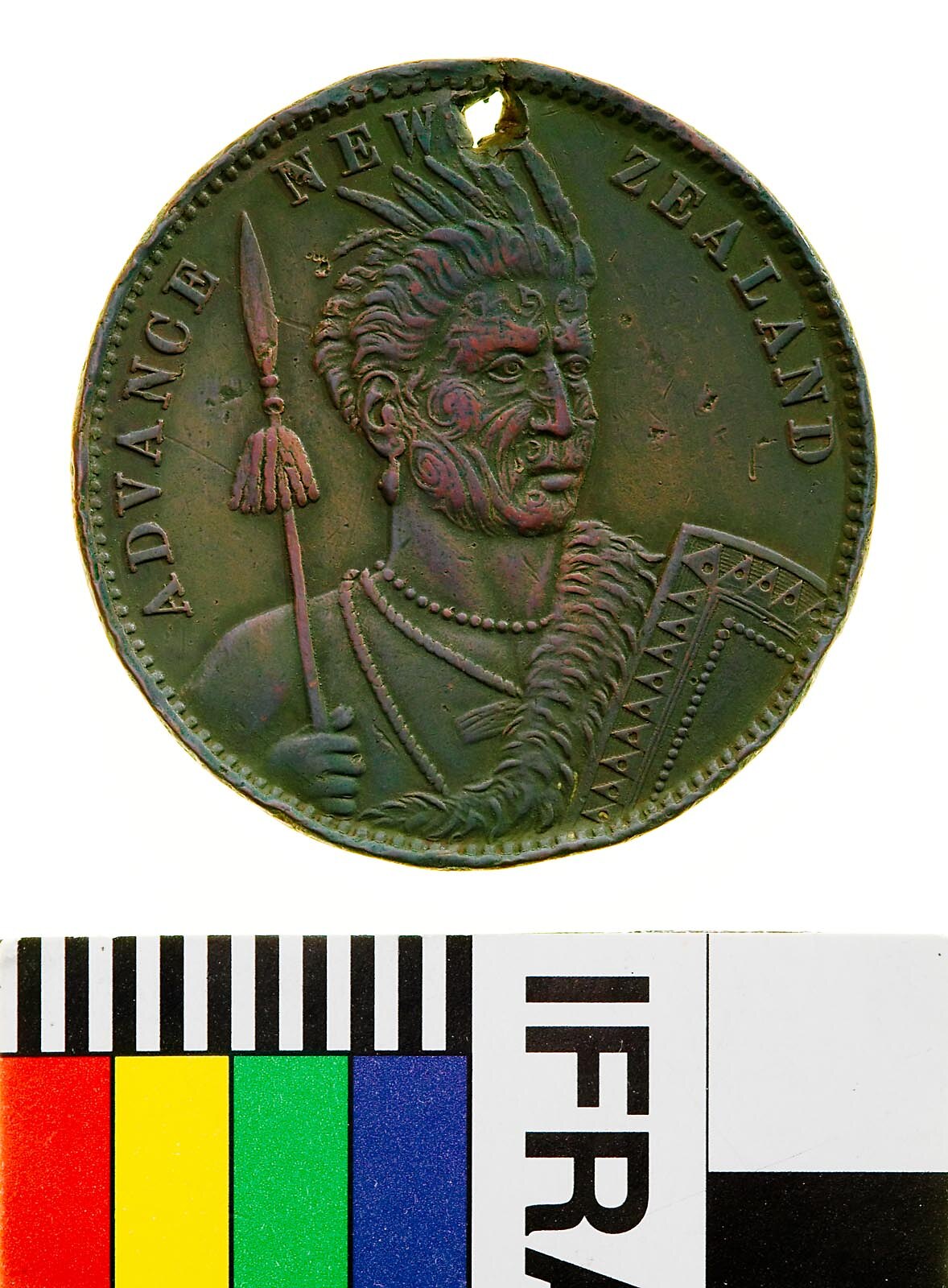 A round copper token (34 mm diameter). The token features a Maori warrior standing on an island in front of a palm tree. He holds a large square shield on the ground with his right hand and a weapon in his left. The shield is quartered with plants in each sector, a kiwi emerges walking left from behind the shield. In the sea behind the prow of a war canoe can be seen to the left of the kiwi and a mountainous island is seen in the background. Around, NEW ZEALAND The reverse features a bust a Maori warrior facing three-quarters right with tattooed face, wearing a feather headdress and holding a spear in his right hand and shield. This token has been cleaned and is holed.