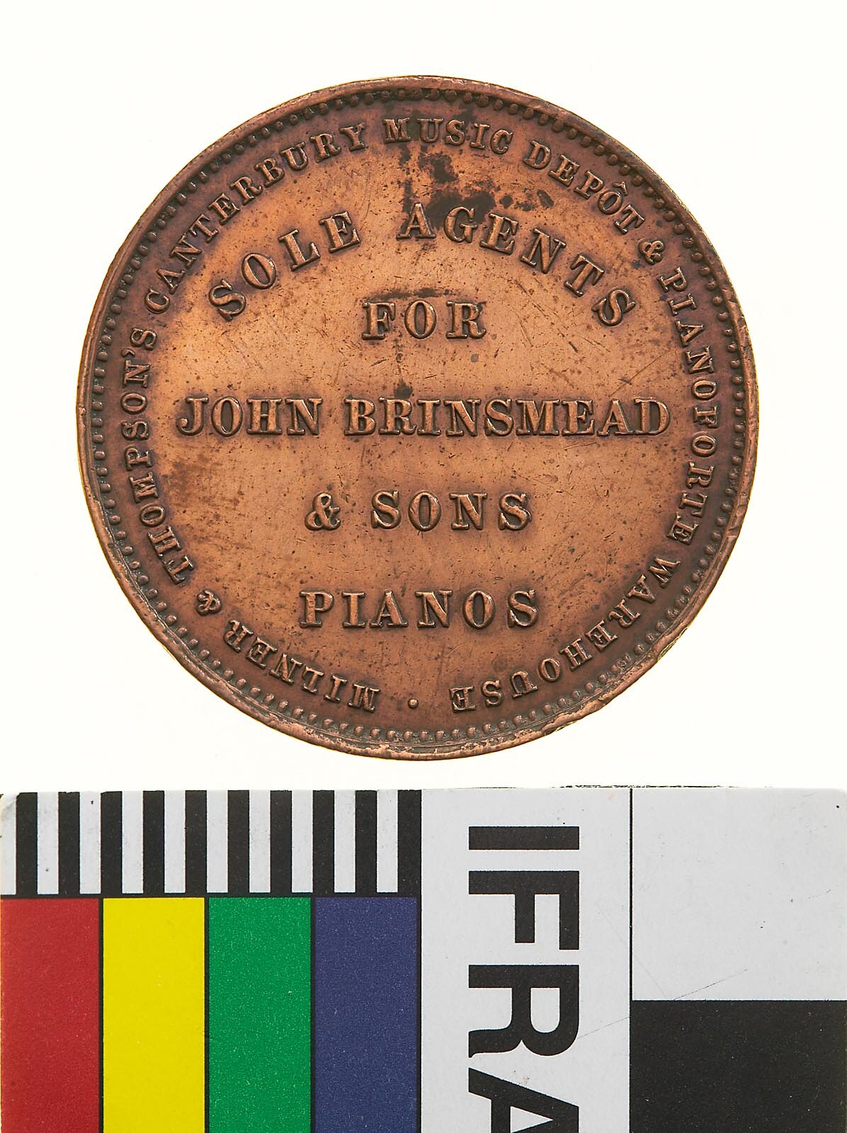 Obverse: SOLE AGENTS FOR JOHN BRINSMEAD & SONS PIANOS MILNER & THOMPSON CANTERBURY MUSIC DEPOT & PIANOFORTE WAREHOUSE. Reverse: NEW ZEALAND