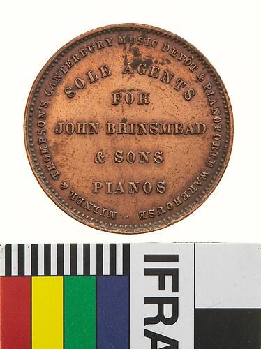 Copper One Penny Token, minted by Stokes & Martin, Melbourne. Issued by Milner & Thompson, Canterbury Music Depot, Christchurch, 1881. Milner & Thompson's Music store, the Canterbury Music Depot, was opened in 1874 by Robert Thompson, some time soon afterwards he took John Milner into partnership and they worked together for 21 years. When Milner retired Thompson continued in the business until he passed it to his sons in 1907. The business was bought by Charles Begg and Co. in 1920, and was still a going concern in 1950. Milner & Thompson were the last issuers of tokens in New Zealand. The firm had a number of novel advertising schemes, in addition to the tokens. They installed a 'phantom piano' on the ground floor, which was set up to give the appearance of being played, while it was in fact being operated from a keyboard and set of pedals installed in the basement below. Thompson also ran a Booking Office for plays from the store from 1881, the first production advertised being staged by the Montague-Turner Opera Co. of Sydney.