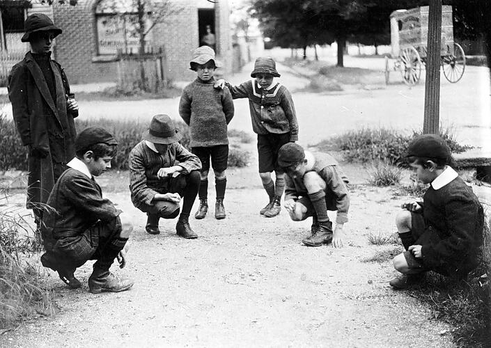 Six small boys playing with marbles. There is an unhitched delivery van in the background.