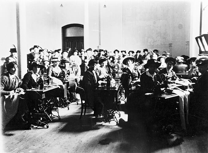 A number of women using sewing machines in a hall. They are being watched by a large group of other women. This may be a wartime photograph.