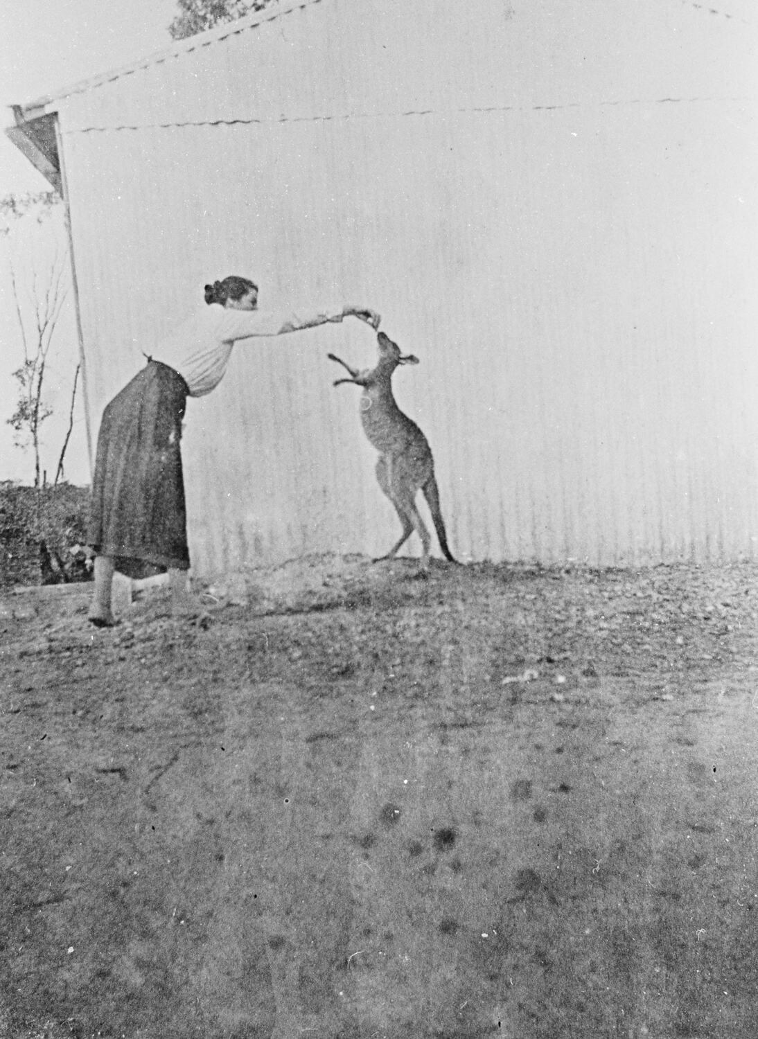 Bella Whelan with a pet kangaroo, possibly at the Esson family's farm in Annuello, 1923.