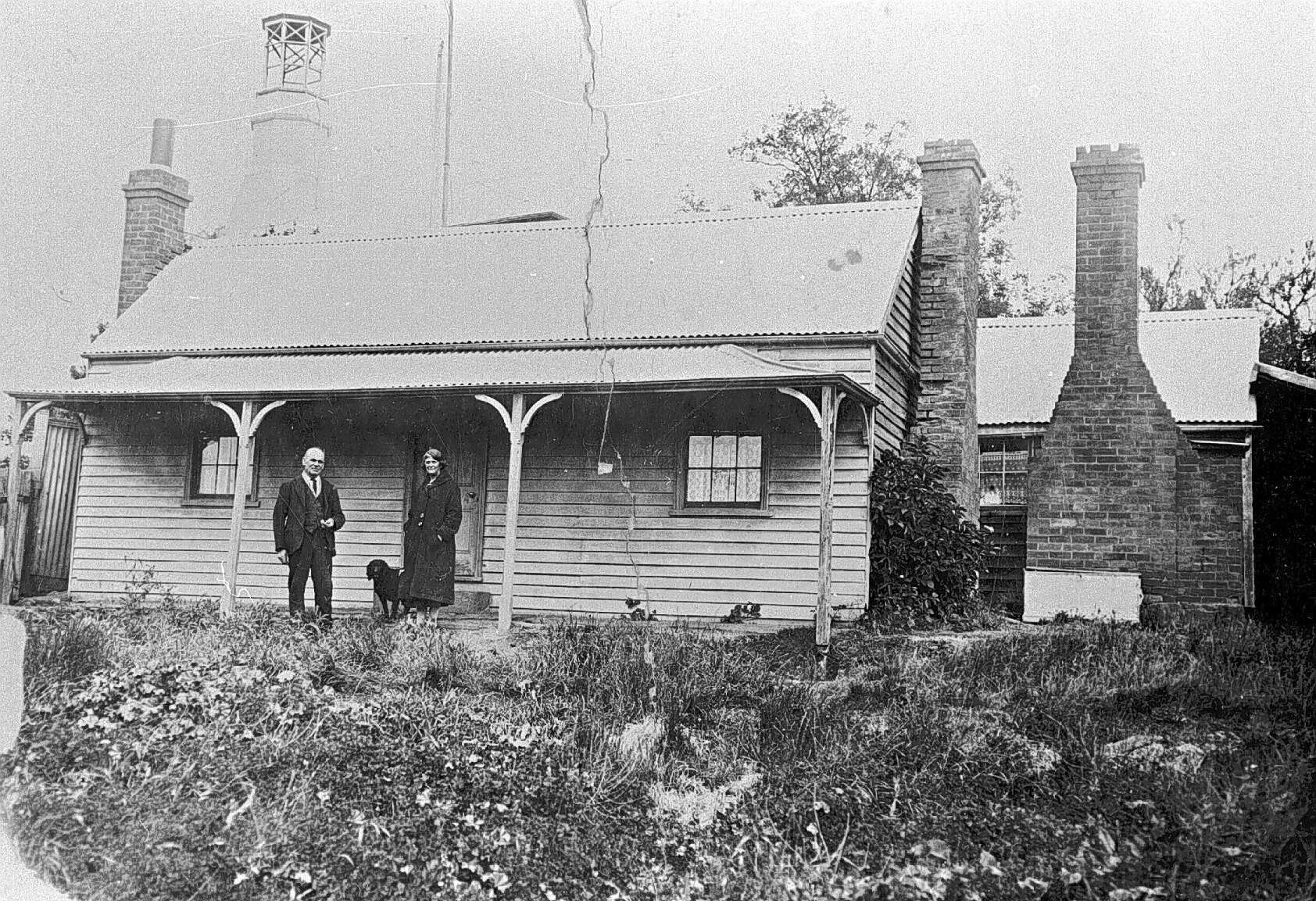 A man and woman in front of a house. There is a belfry (or lookout?) apparently attached a building behind the house.