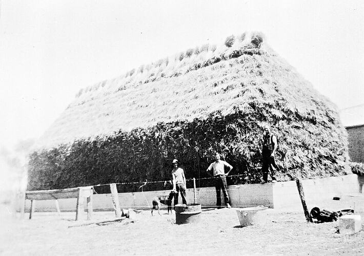 Two men standing in front of a haystack. There is a mouse guard around the haystack.