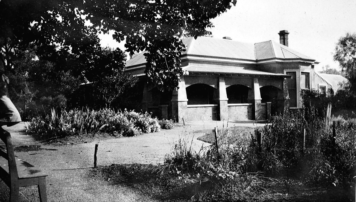 A brick house and garden, with a solid return verandah. Established gardens at the front, with paths and a driveway leading to the house.