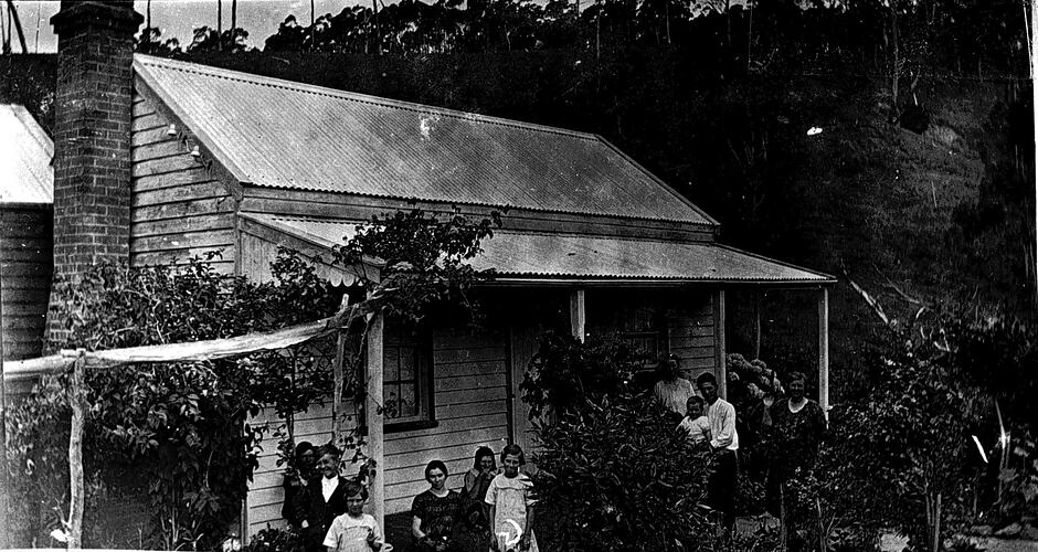 A group of people outside a small wooden house with a corrugated iron roof. There is a vine growing beside the house.