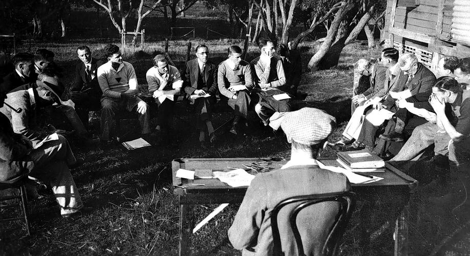 A group of men at a Young Mens Christian Association conference. They called themselves the 'Y's Men'. They are seated outside.